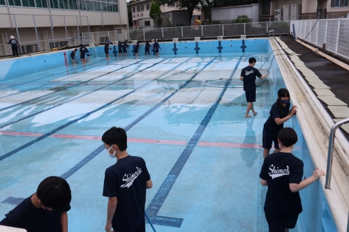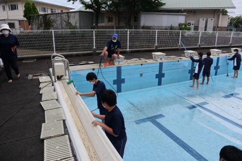 全校生徒・教職員で毎年恒例のプール掃除を実施しました。 昨年からあまり汚れがなく、スムーズに行うことができました。 生徒達も協力して行い、とても綺麗になりました。 いよいよ水泳が始まります。体調を整えてしっかり泳ぎましょう!
