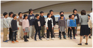 ステージに立ったとたん緊張した面持ちになった子どもたち。合唱の歌い出しでは、場の雰囲気に飲まれた感じがしましたが、低音と高音に分かれてのハモリは、練習通りに美しく響かせることができました。