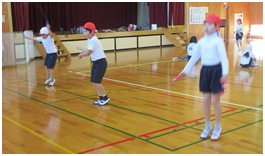 集会では、個人種目と赤白に分かれての大縄跳びが行われました。個人種目では、「あや跳び」や「二重跳び」等、それぞれの目標に向かって挑戦し、最後まであきらめずに跳び続ける姿に成長を感じました。