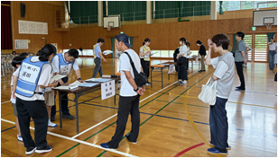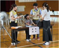 参観日に合わせて引き渡し訓練を行いました。 梅雨明け真近の蒸し暑い日でしたが、避難場所になっている体育館で行いました。