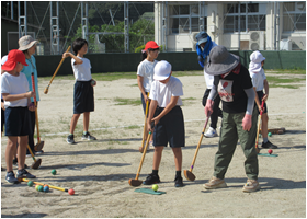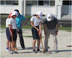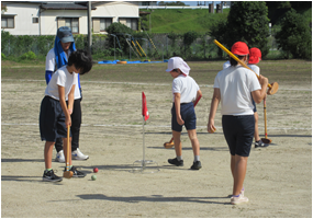 今回は、校庭で練習試合を行いました。3か月ぶりのグランドゴルフでしたので、力が入り過ぎて遠くまでボールを転がす児童もいれば、弱く打ち過ぎて全くボールポストまで届かない児童もいました。