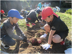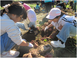 1・2年生が実崎の池本区長さんの畑をお借りして育てていたサツマイモが収穫の時期を迎えました。 1・2年生だけではとても掘り切れないため、全校児童総出で芋ほりを行いました。 次々と出てくる大きなさつまいもに子どもたちは大喜び!