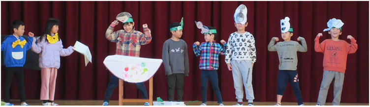 今年度2回目の1・2年生の発表朝会がありました。「サラダでげんき」の音読劇を行いました。 当日、休みの児童が数人いたため急遽代役を立て、最終確認をする間もなく、本番の時間迎えをましたが、子ども達同士で協力し合い、助け合いながら、立派に発表することができました。手作りのお面や野菜の小道具を使いこなしながら、役になりきってがんばる姿は、子どもたちの成長を感じました。